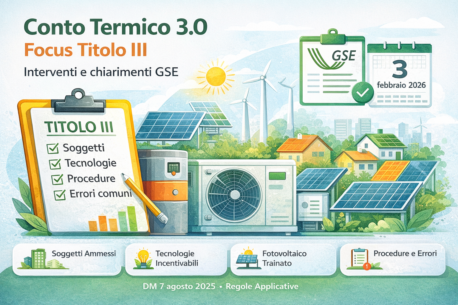 Il 3 febbraio 2026 il GSE ha dedicato un webinar di approfondimento specifico al Titolo III del Conto Termico 3.0, proseguendo il ciclo di incontri avviato a gennaio con il focus sugli interventi di incremento dell’efficienza energetica (Titolo II).